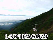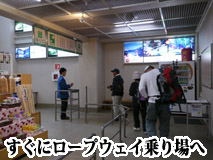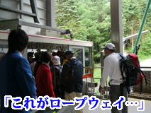 30分ほどバスに揺られて山道を進み、ようやくロープウェイの駅、しらび平駅に到着しました。一息つく暇もなく、すぐにロープウェイ乗り場へ急ぎます。ロープウェイは出発直前でぎりぎり間に合いました。さすが人気の山ということもあってこんな時間でも中はすし詰め状態。