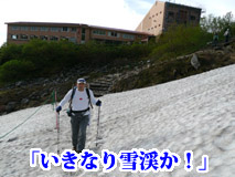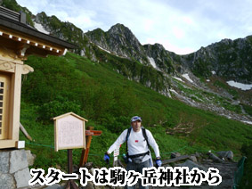 スタートは鳥居をくぐった駒ヶ岳神社から。ここから雪渓を横断し、千畳敷を登っていきます。