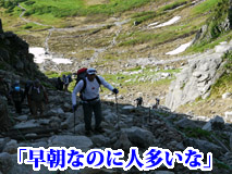 進むにつれて道が険しくなってきました。落石防止のための金網が至る所で岩塊を固定しているので落石の心配は無さそうです。しかし油断は禁物。遅い登山者を追い越すことで自分のペースを乱しがちになるので、あくまでマイペースを守りながら登ります。見上げると、あそこが登り切るところ?