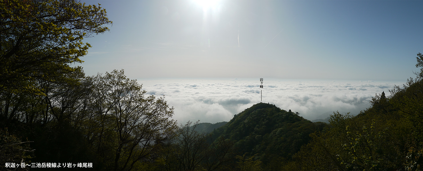 雲海の景色を楽しんだ後は、岩ヶ峰に向かって険しい登り。既に鏡岩も過ぎていた。傾斜が緩くなってシャクナゲの木が多くなってくると、岩ヶ峰に到着だ。岩ヶ峰からは景色は望めない。少々休憩した後に稜線に向けて歩き出す。途中で右側にかすかに踏み跡があるのだけど、ここは登山道の北にある沢を横断して稜線へと通じる道。途中踏み跡も薄く、稜線直下はザレた急坂でほぼ道はないので、立ち入るには注意したい。
