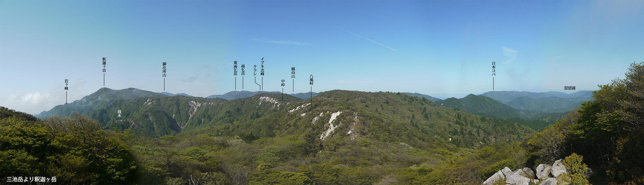 最後の坂を登って三池岳に到着。ここは山頂だけど、三角点はここからちょっと東にある。歩いてきた尾根を振り返ると、釈迦に向けていつになく見通しがいい。右手には薄っすらと琵琶湖だ。北側には竜ヶ岳が見えているけど、望遠で見てみると何人か山頂に立っている。