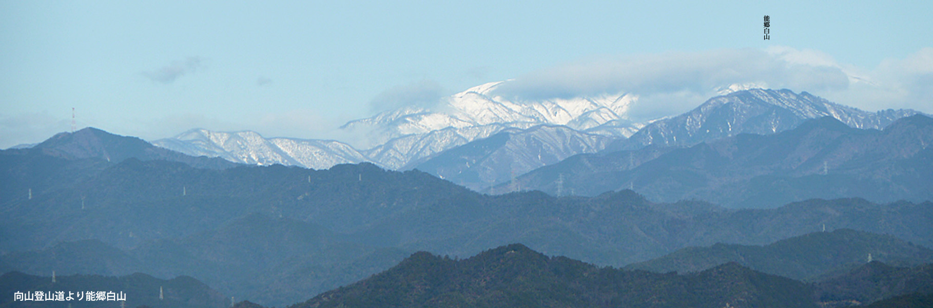 今日の出発地点は昨年11月に上った向山の登山口から2km弱西に行ったところ。三ツ池公園の西の端にある駐車場に車を停める。天気予報に反してポツポツと小雨が降ってきたけど、雲が通っていっただけのようだ。まずは道路に沿ってちょっと東にある向山登山口へと歩く。三ツ池公園は字の如く池が三つあり、道路を挟んで池と反対側に登山口の小さな標識が立っている。ここからまずは向山からの稜線目指して登っていく。踏み跡は明瞭で、ジグザグに登っていくようだ。しばらくは樹林帯の中だけど、ジグサグを登り切るとわずかに南方面の景色が開けてくる。遠くに小津権現、そして能郷白山だ。そろそろ稜線か?というところで桐谷坂と向山分岐の看板が現れた。ここは桐谷坂方面へ。ちょっと踏み跡が薄いけど間違いではない。分岐からすぐに稜線に到達。