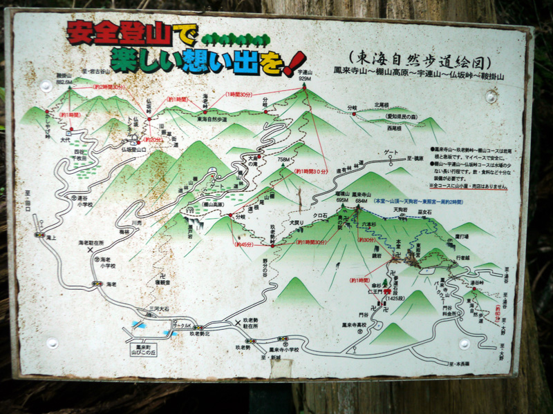 今日歩くルートは鳳来寺本堂からまず鷹打場へ行き、鳳来寺山山頂を経て本堂に戻る左回りの周回だ。まずは本堂右手に続く道へ進む。行く手にはトイレはわかるが、何と自販機まである。やはりこの時点ではまだ登山じゃないな。道なりに進んでいくと、東照宮の標識がある。左手の石段を上がっていくと鳳来山東照宮だ。ちなみに、ここを真っ直ぐ行くと鳳来寺山パークウェイの山頂駐車場に出る。石段を歩くのが嫌な人は山頂駐車場まで車で上がればいいけど、有料だからね。