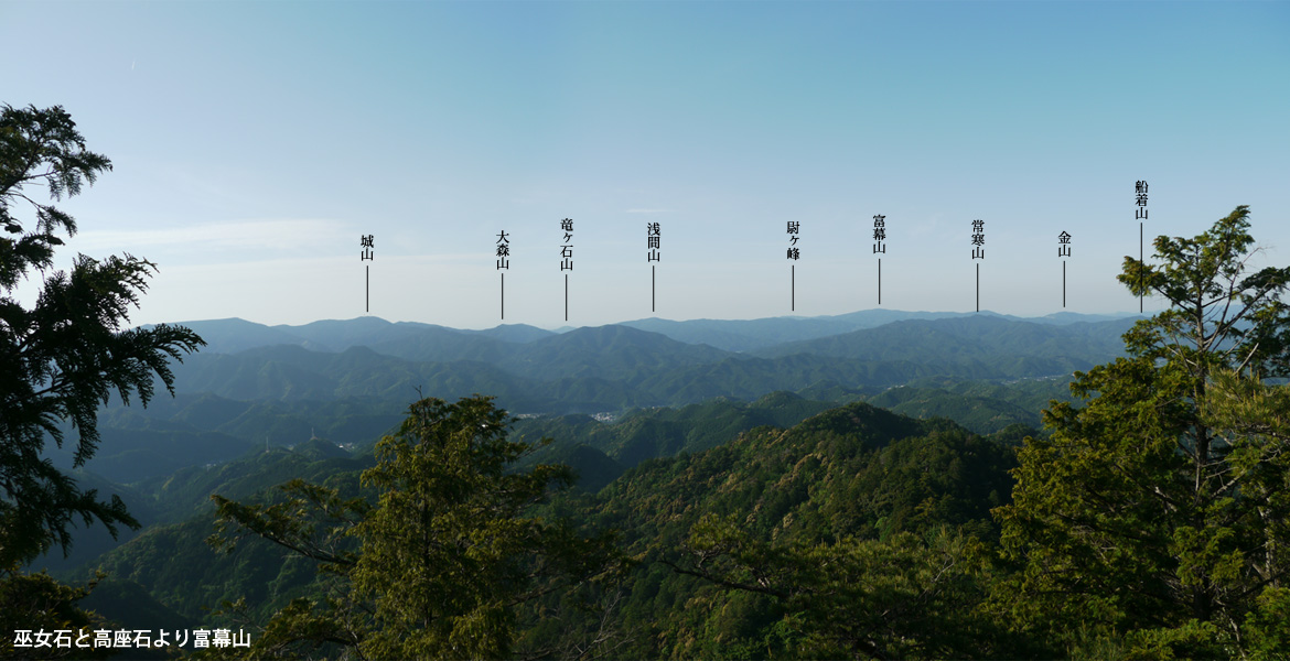 本ルートに戻り、次の目的地である鳳来寺山山頂に向かう。ここからはちょっと登りもきつくなり、路面も木の根が張り出して荒れてくる。やはりここは遊歩道ではなく登山道だ。しばらくすると「巫女石と高座石」の看板が木に取り付けられている。鳳来寺山由来書に記されている石らしいが、近くにケルンのような石が積まれたところがあり、文部省の石柱が立っている。これが巫女石と高座石なのかわからない。そして木々の隙間からは富幕山が見える。