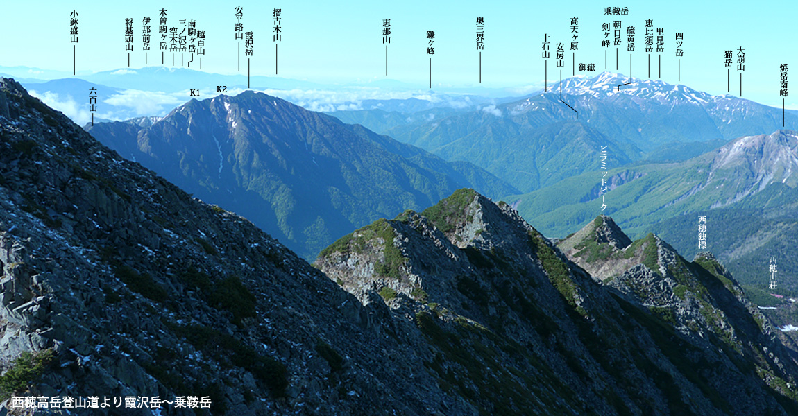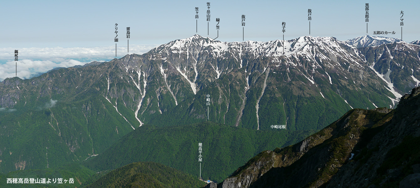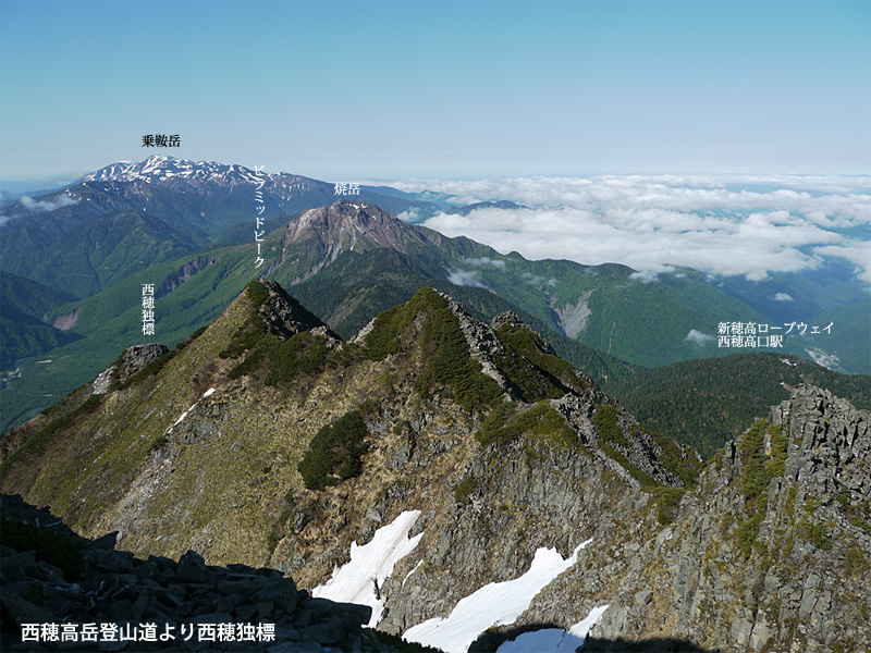 順調に下山している。見下ろすとすっかり上高地の雲海は消え、梓川が見えている。そして新穂高側も徐々に雲海が消えつつある。それにしてもすごいルートだ。笠ヶ岳から見る西穂への稜線はギザギザで、見るからに難所だ。チャンピオンピークは4峰。次はピラミッドピーク。