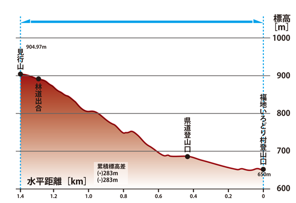 山行レポート 2025年7月21日 ◆概要(断面図はクリックで拡大します) 見行山 年月日 2025年7月21日(月) 天気 晴れ 最高到達標高 904.97m(見行山) 水平距離 2.8km 累積標高差 (+)283m (-)283m