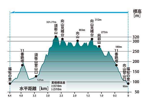 山行レポート 2025年12月28日 ◆概要(断面図はクリックで拡大します) 向山見晴台 年月日 2025年12月28日(日) 天気 晴れ 最高到達標高 321.77m(須衛山) 水平距離 4.4km 累積標高差 (+)510m (-)510m