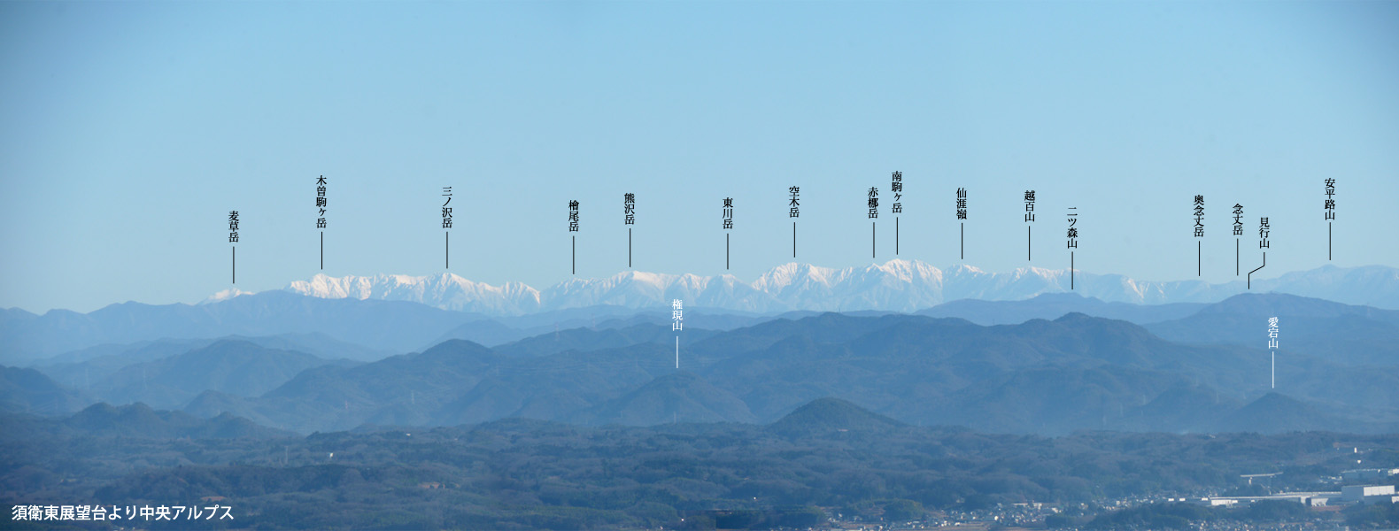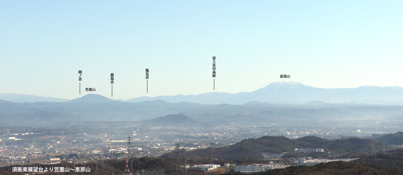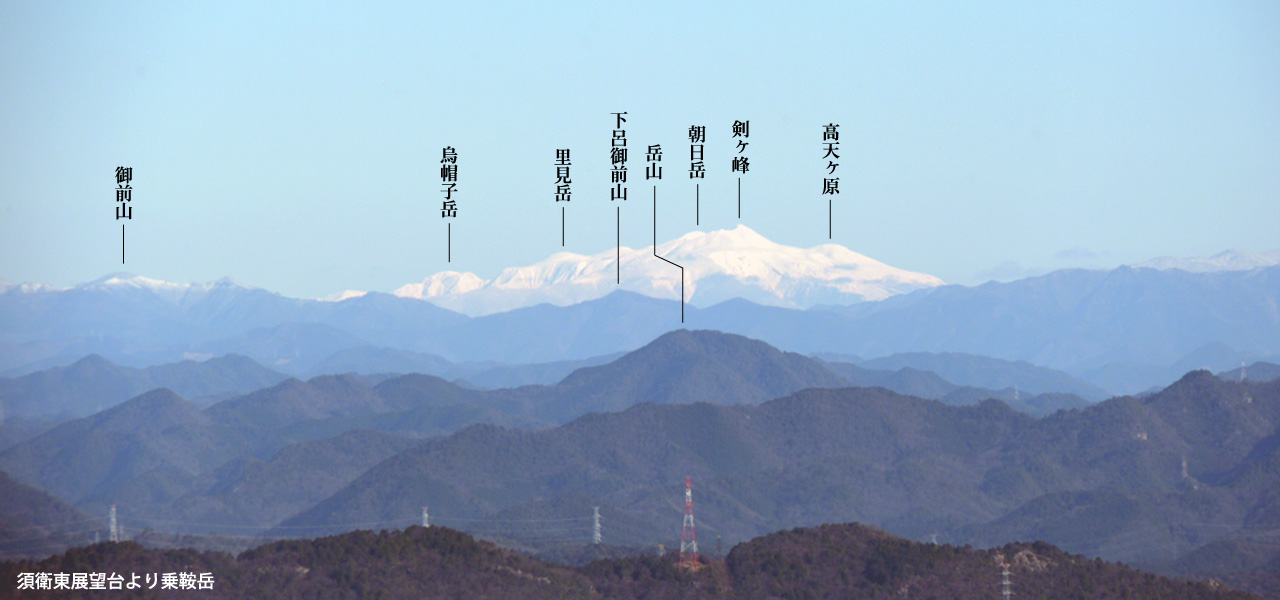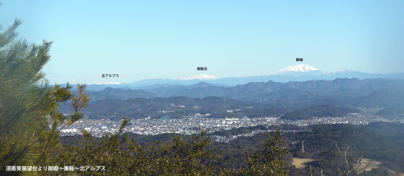 各務原・関南アルプスの東部を望む。よく見ると明王山の鉄塔が見えている。今の体力であそこからここまで縦走することはできるのだろうか? 近郊の山といってもかなりハードだ。