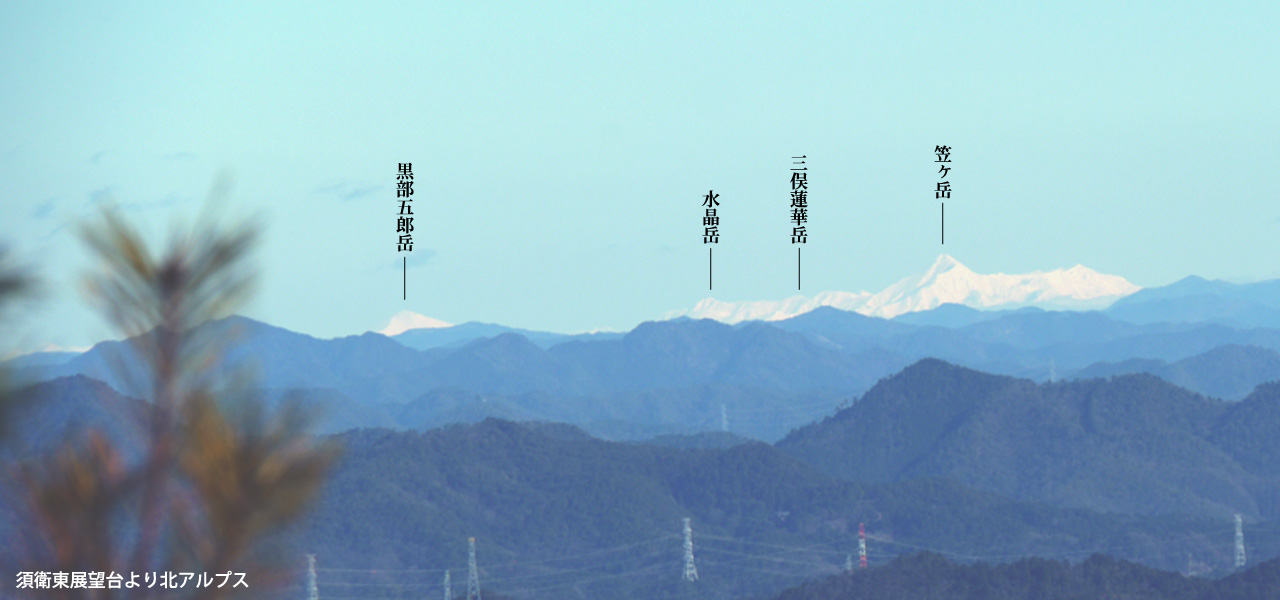 ここから見える北アルプスは笠ヶ岳から北の稜線。笠と三俣蓮華の間にはわずかに鷲羽岳の山頂もちらっと頭を出している。左に顔を出しているのは黒部五郎。意外にこのやまはいろいろなところから見える。