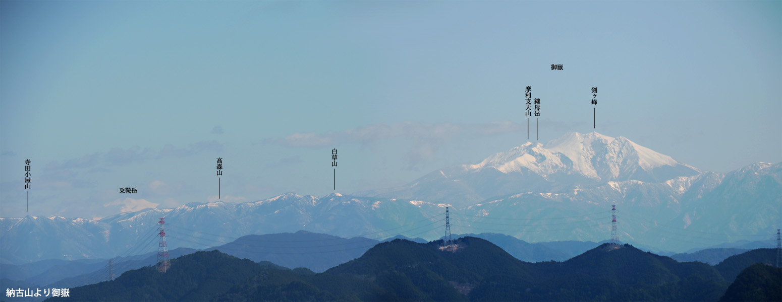 納古山山頂に到着。人はいるのだけど、10人もおらず思った以上に賑わってはいない。今日もいつもと変わらずなかなかいい眺めだ。当たり前だけど天空岩の眺めよりも御嶽が大きく見える。遠くは雲が掛かっていて乗鞍より北はちょっと見えない。しかし登るたびに思うのは、何度来てもいい山だな。