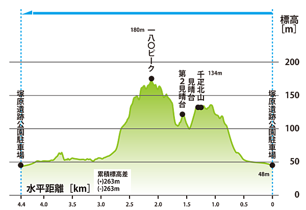 山行レポート 2025年12月30日 ◆概要(断面図はクリックで拡大します) 千疋北山 年月日 2025年12月30日(火) 天気 曇り時々晴れ 最高到達標高 180m(180ピーク) 水平距離 4.4km 累積標高差 (+)263m (-)263m